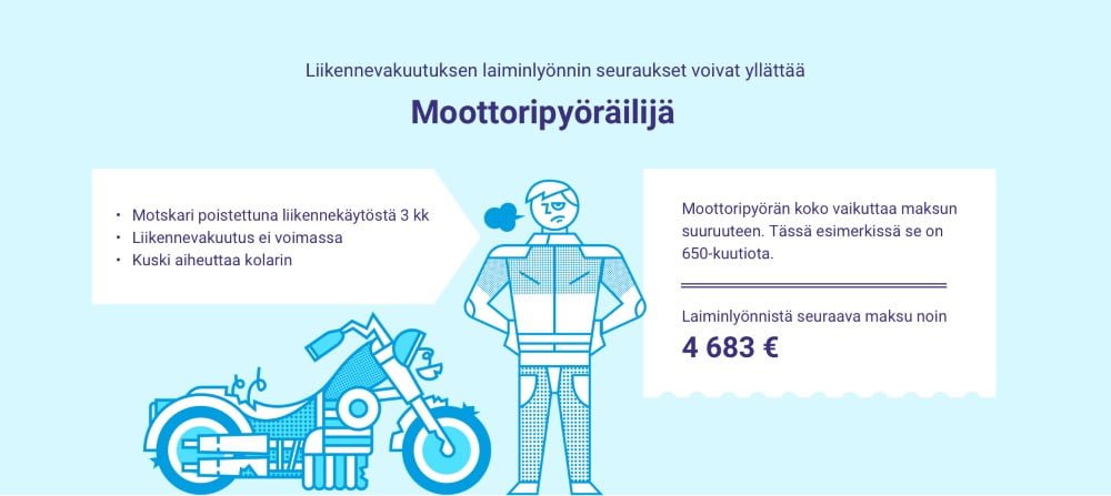 – Esimerkiksi isomman moottoripyörän maksut voivat olla vaikka 30 000 euron luokkaa, jos se on ollut vuoden vailla liikennevakuutusta, mutta sillä kuitenkin ajetaan ja aiheutuu kolari. Yleisimmin laiminlyöntitapauksissa puhutaan satojen tai tuhansien eurojen maksuista, ajoneuvosta riippuen.
