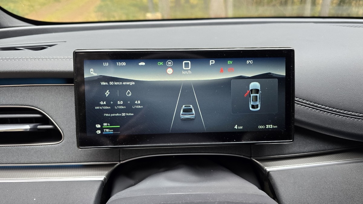 Tarkkoja kulutuslukemia emme saaneet laskettua ajomatkalle, mutta mittaristosta käy ilmi keskikulutus niin sähkön kuin bensan osalta aina viimeisimmälle 50 kilometrille. Koeajossa ei päästy varmaan ihan valmistajan ilmoittamiin kulutuslukemiin, mutta ne ovat varmasti melko hyvin suuntaa antavia. Auton kokoon nähden kulutuslukemat ovat ihan kohtuulliset suomalaisiin tieoloihin.