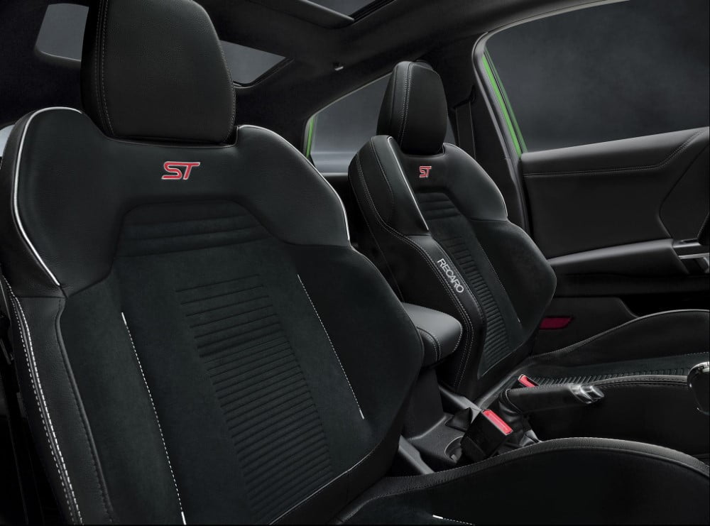 Lämmitettävät ja pehmustetut Recaro-urheiluistuimet on koristettu ST-logolla ja viimeistelty liukumattomalla Miko Dinamica -kankaalla, minkä ansiosta sekä kuljettaja että etumatkustaja pysyvät tiukasti penkeissään.