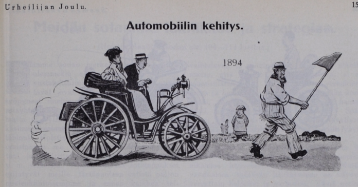 Vuonna 1894 automobiilin edessä kulki lippua heiluttava mies varoittamassa muita tiellä liikkujia automobiilin tulosta.