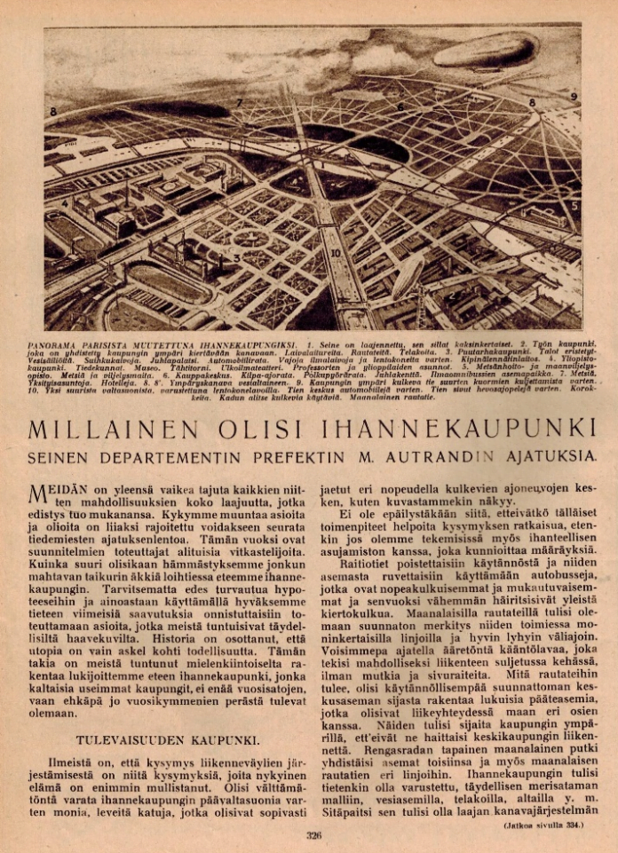 Nykypäivän vinkkelistä katsottaessa osattiin jo lähes 100 vuotta sitten kartoittaa ja ennakoida kaupunkimiljöön kitkakohdat harvinaisen hyvin. Suunnitelmassa oli, kuten kuvasta näkyy, todellista ideoiden ryöppyä.