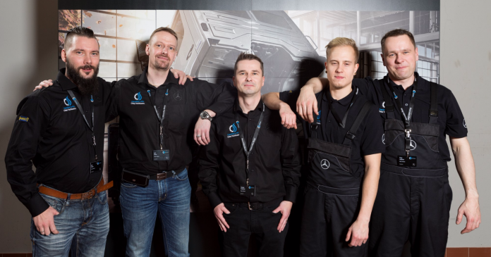 Vasemmalta varaosamyyjä Jori Heino (Veho Oy Ab, Pirkkala), työnjohtaja Jari Kossi (Veho Oy Ab, Pirkkala), tuotepäällikkö Tuomas Vuorinen (Mercedes-Benzin maahantuonti), huoltoasentaja Juuso Niinimäki (Veho Oy Ab, Lahti) sekä diagnoosiasentaja Timo Aspinen (Raskone Oy, Lappeenranta).