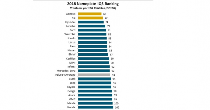 Yhdysvalloissa on taas julkaistu vuosittainen uusien autojen laatututkimus, J.D. Power 2018 U.S. Initial Quality Study (IQS).