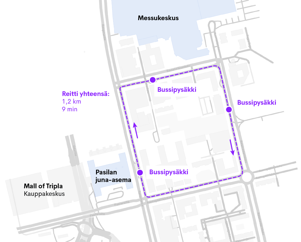 Liikennöintiympäristönä Helsingin Pasila on selvästi haastavampi kuin aikaisempien pilottiprojektien reitit. Pasilassa robottibussit ajavat muun liikenteen seassa ja huomioivat kevyen liikenteen ja myös raitiovaunut.