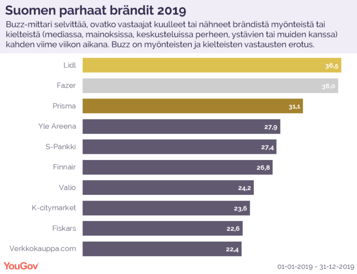 YouGov BrandIndex mittaa päivittäin brändien ympärillä tapahtuvaa pöhinää (Buzz) yli 300 brändin osalta Suomessa.