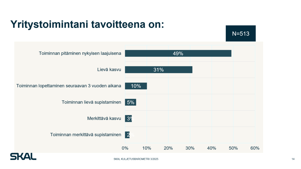– Monelle perheomisteiselle kuljetusyritykselle toiminnan pitäminen nykytasolla on tarkoituksella valittu strategia. Vastaajista 42 prosentilla kasvun esteenä on oma haluttomuus kasvaa. Määrä on merkittävästi suurempi kuin vuonna 2022 (34 %), sanoo SKALin toimitusjohtaja Anssi Kujala.