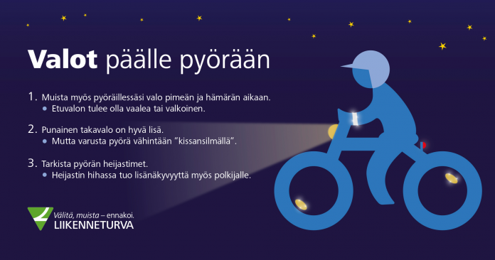 – Se, että itse näkee polkea, ei vielä tarkoita, että muut liikkujat havaitsisivat sinut. Pyörän valoa tarvitaan myös valaistuissa taajamissa. Syysiltojen pimetessä yhä aikaisemmin kannattaa hämäryyteen varautua ottamalla pyörän valo mukaan jo aamusta. Vanhempien kannattaa tarkistaa, että lasten pyörissä on valot ja heijastimet kunnossa, ja varmistaa lapselta, että valoa myös käytetään, summaa Liikenneturvan yhteyspäällikkö Leena Piippa.
