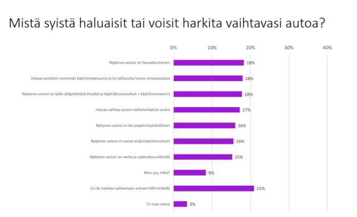 Painavimpien syiden joukkoon lukeutuvat nykyisen auton huono kunto ja – usein siitä johtuen – menopelin kallis ylläpito huoltoineen, käyttökustannuksineen ja käyttövoimaveroineen. Myös aiempaa parempi auton käyttömukavuus ja turvallisuus ovat ominaisuuksia, jotka suomalainen ottaa useimmin huomioon auton vaihtoa harkitessaan.
