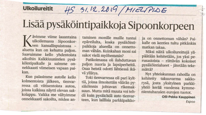 Tänään yksi Helsingin Sanomien lukija harmitteli, että Sipoonkorpeen vievän Kalkkiuunintien varteen pysäköineet autot oli sakotettu.