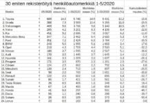 Alkuvuoden rekisteröintitilasto on kärsinyt melkoisesti koronaviruksesta.Kärjessä melkein 15 prosentin markkinaosuudella on Toyota. Merkkiä on vuoden viiden ensimmäisen kuukauden aikana rekisteröity 5 748 autoa.Toisella sijalla...