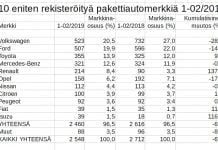 Pakettiautojen rekisteröintimäärä vuoden kahden ensimmäisen kuukauden aikana on pienentynyt 6,0 prosenttia viime vuoden vastaavaan aikaan verrattuna.Volkswagen on edelleen kaikkein suosituin merkki 10,5 prosentin markkinaosuudella....