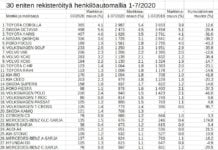Rekisteröinti: Vain 12 merkkiä Suomen 30 suosituimman henkilöauton listassa