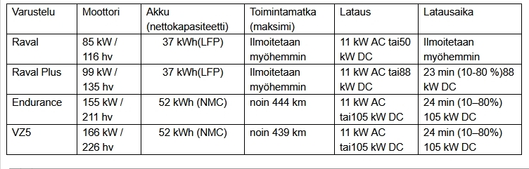 Lanseerausvaiheen erikoisversioiden lisäksi Raval tulee saataville neljänä perusversiona. Raval (85 kW) ja Raval Plus (99 kW), joissa on 37 kWh LFP‑akku ja DC-lataus on vakiona. Endurance (155 kW) ja VZ (166 kW), joissa on uusi 52 kWh NMC unified cell ‑akku, ja jopa 444 km toimintamatka (WLTP) sekä jopa 105 kW DC-lataus.