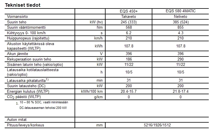 EQS 450+: energiankulutus 15,7–20,4 kWh/100 km (WLTP), CO2-päästöt 0 g/km