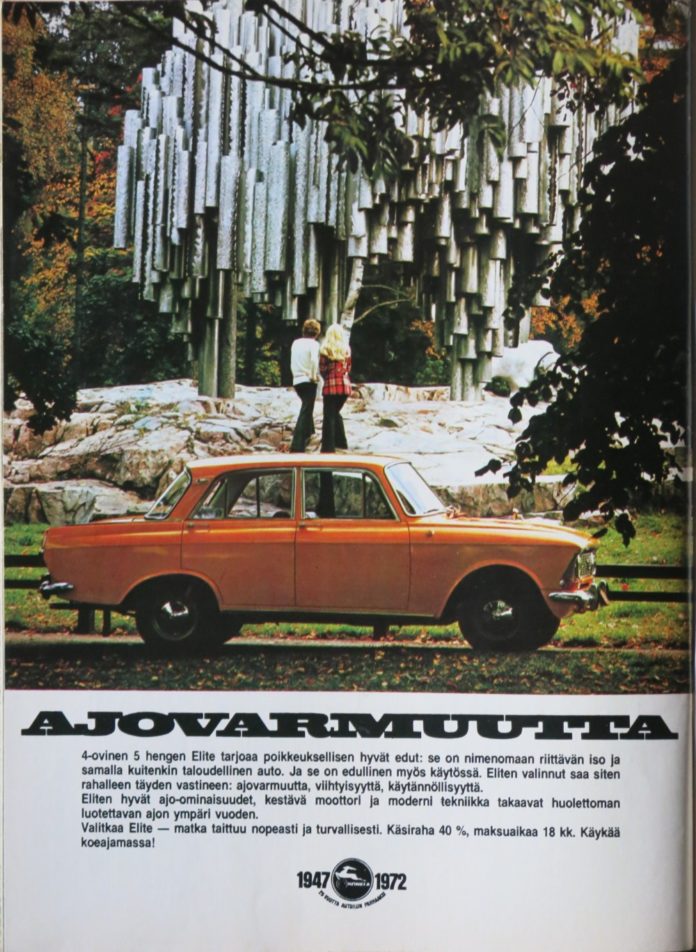 Konela mainosti vuonna 1972 Moskvitsh Elite -malliaan ajovarmuudella. Tai oikeastaan mainoksessa ei puhuttu Mossesta ollenkaan! Markkinoinnissa käytettiin vain Elite-nimeä.