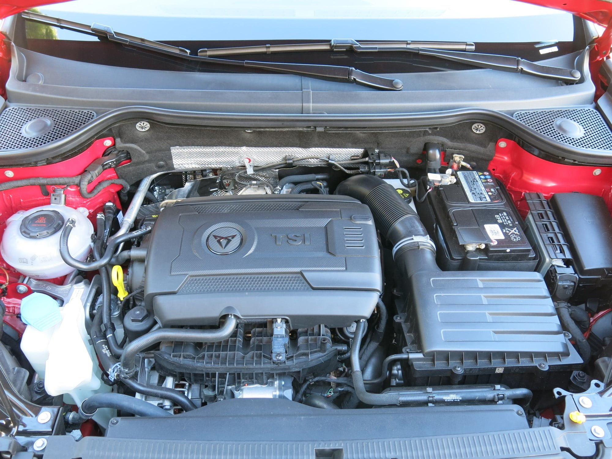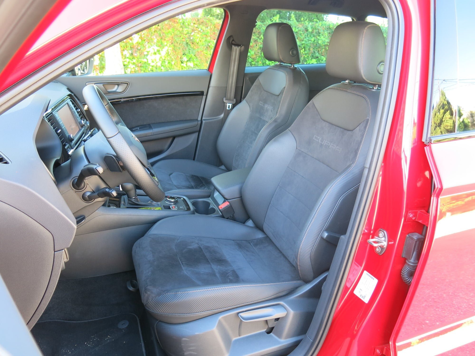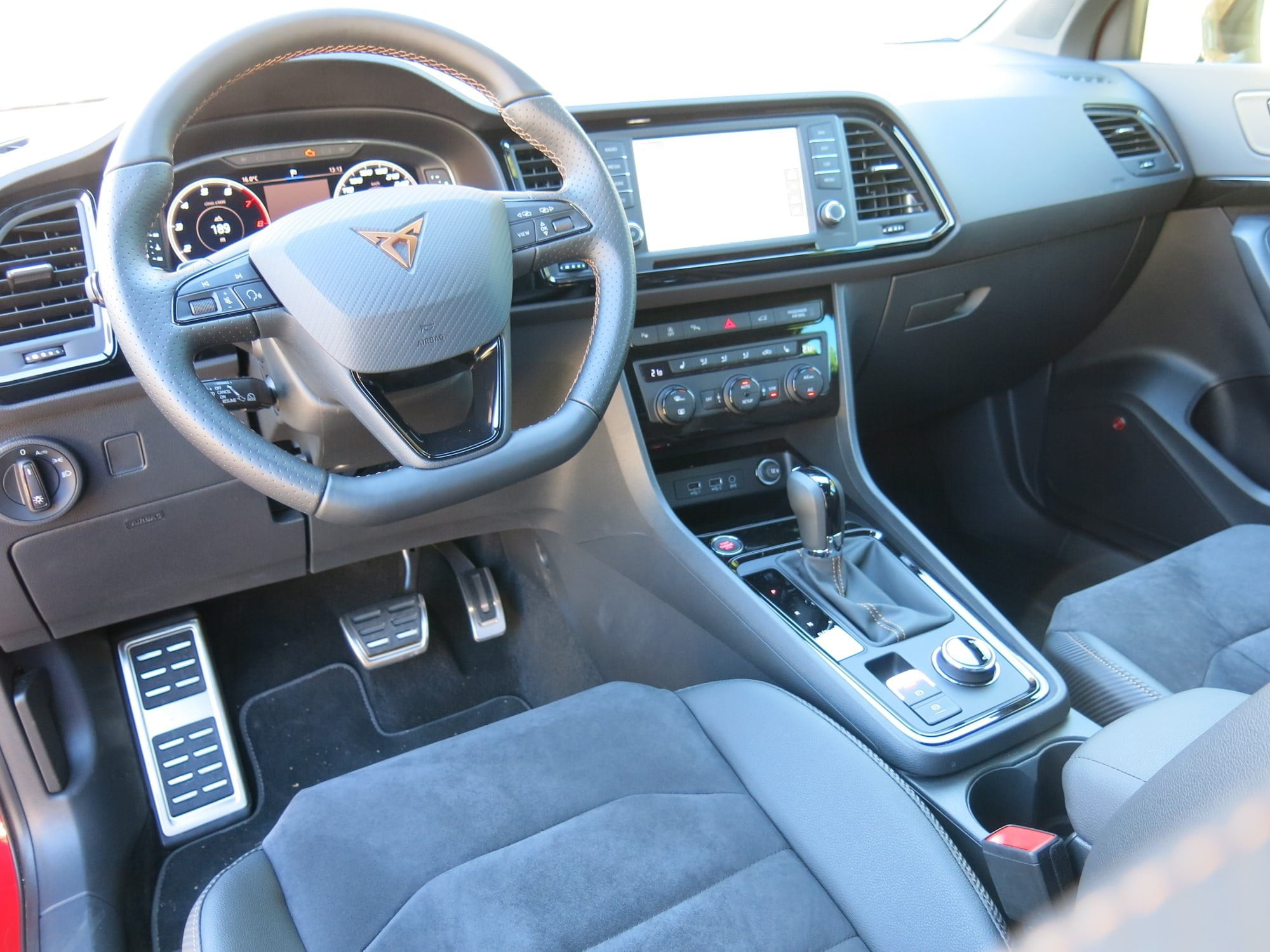 Kuljettajan paikalla vaikutelmaa täydentävät urheiluohjauspyörän nahkapäällysteessä jatkuva kuparitikkaus sekä ratin keskiöön että vaihdekepin nuppiin kohokuvioitu Cupra-logo.