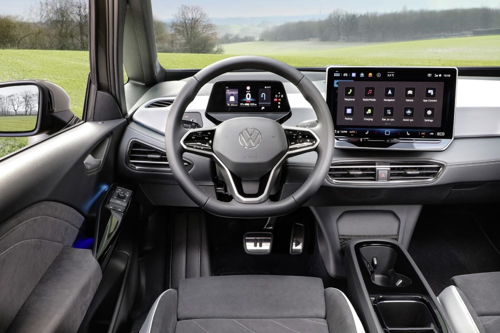 ID.3-mallin ohjaamo on saanut uuden ilmeen. Uusimman sukupolven infotainment-järjestelmässä on suurempi 12,9” kosketusnäyttö ja uusi, intuitiivinen valikkorakenne. Monitoimiohjauspyörää on myös parannettu, mikä mahdollistaa yksinkertaisemman ja intuitiivisemman käytön.