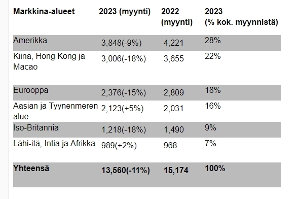 Alueellisesti tarkasteltuna vaikeat markkinaolosuhteet jatkuivat, ja vaikka kasvu oli positiivista Aasian ja Tyynenmeren alueella (+5 %) ja Lähi-idässä, Intiassa ja Afrikassa (+2 %), tärkeimmät markkinat, kuten Kiina ja Iso-Britannia, laskivat 18 prosenttia molemmissa tapauksissa.