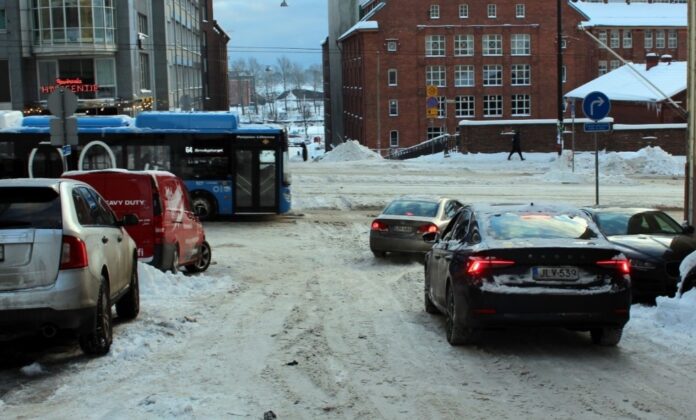 Ennen risteystä ei ole väistämisvellisuutta osoittavaa liikennemerkkiä. Vasemmalta tuleva bussi ei kuitenkaan väistä henkilöautoja, koska kuljettaja tuntee paikan ja tietää, että oikealta tulevat ovat väistämisvelvollisia. Ajojärjestyksen määräävä tekijä on lumen alla. Kuva: Autoliiton Helsingin seudun osasto.