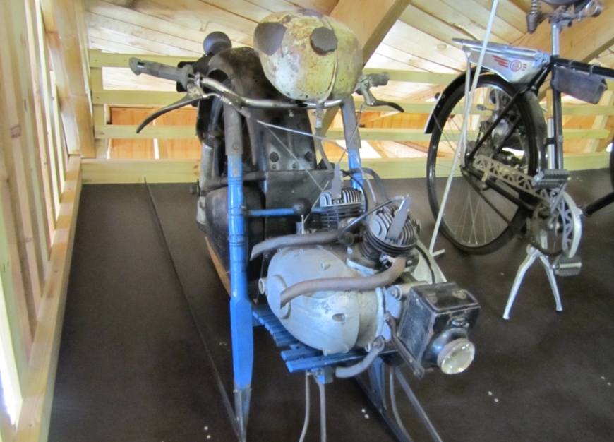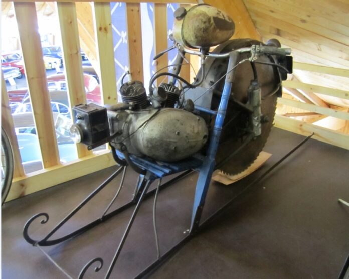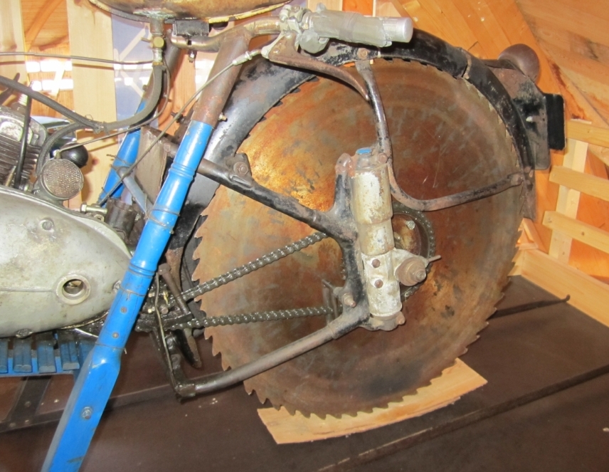 Kyse on viime vuosisadalla puhdetyönä tehdystä Jääkiitäjästä. Erikoista ajoneuvossa on takapyörä, joka on alun perin sirkkelin terä. Eipä tarvita ainakaan lisänastoja.