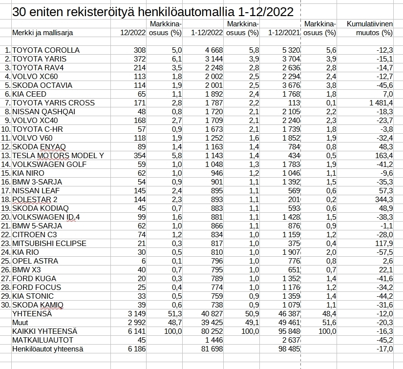 Vuosi 2022 oli poikkeuksellinen käänteiltään automarkkinoiden näkökulmasta. Pitkittynyt ja moniin tuoteosiin laajentunut komponenttipula jarrutti rekisteröintien määrää ja erityisesti henkilöautomarkkinassa rekisteröintien määrä jäi historiallisen alas.