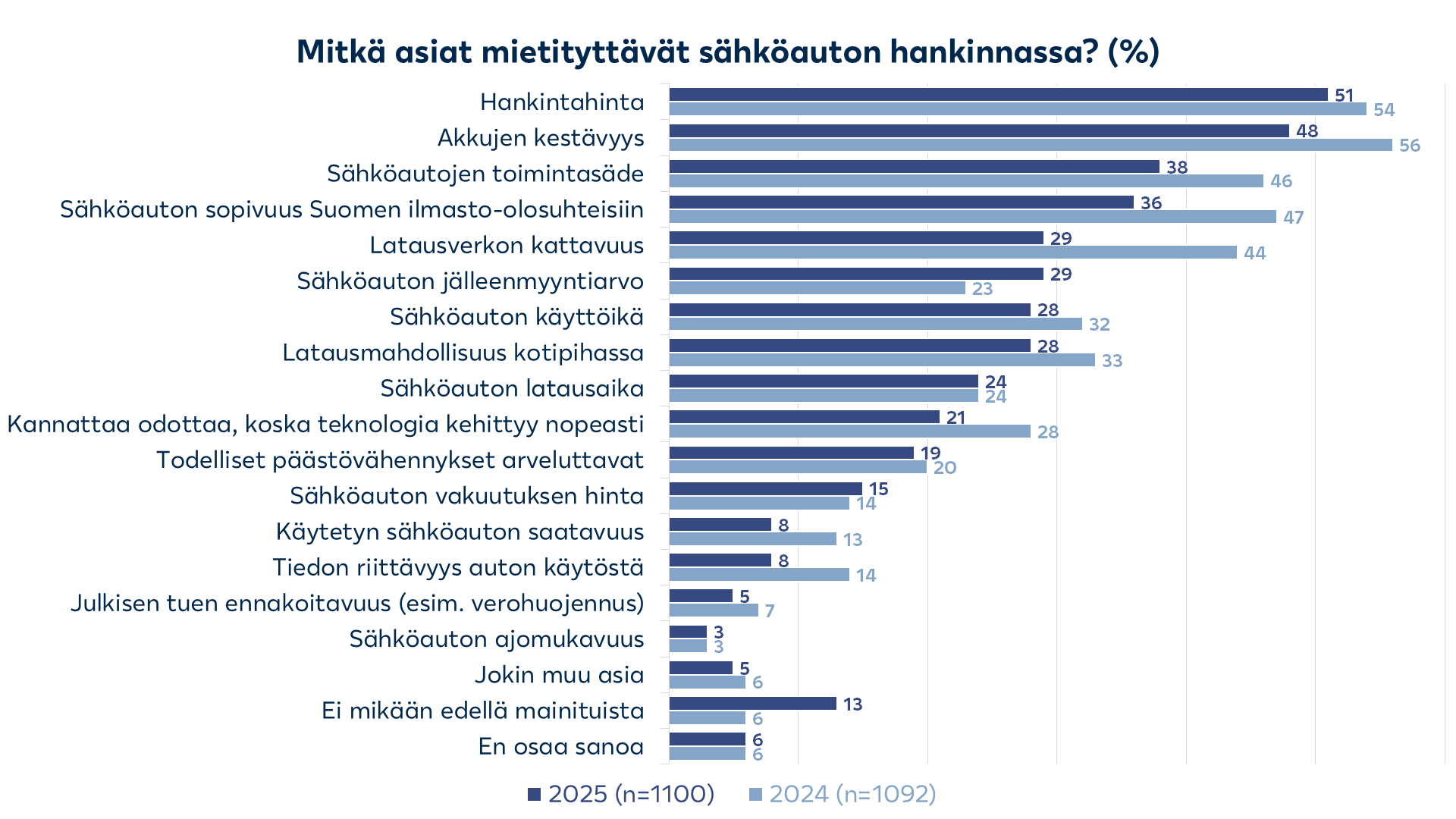LähiTapiolan teettämän Arjen katsaus -kyselyn mukaan akkujen kestävyys mietityttää enää 48:aa prosenttia suomalaisista, kun vuonna 2024 osuus oli 56 prosenttia. Sähköauton toimintasäde ja sopivuus Suomen ilmasto-olosuhteisiin mietityttävät enää alle 40:ää prosenttia vastaajista, kun vuotta aiemmin nämä mietityttivät lähemmäs joka toista vastaajaa. Myös sähköautojen latausverkon kattavuuteen liittyvät huolet ovat selvästi harvinaisempia. Kyselyt toteutti tutkimusyhtiö Verian*.