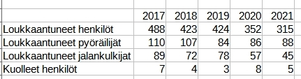 Vuoden 2022 ensimmäisen yhdeksän kuukauden aikana loukkaantuneita oli 184, kun niitä vuonna 2021 samalla ajanjaksolla oli 209. Mikäli kehitys jatkuu loppuvuoden, puolittuu liikenteessä loukkaantuneiden määrä vuoteen 2017 verrattuna.