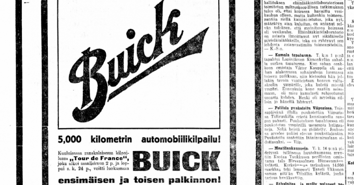 ”Kuuluisassa ranskalaisessa kilpailussa ”Tour de France”, joka alkoi maaliskuun 2 p. ja loppui s.k. 24 p., voitti luokassaan Buick ensimmäisen ja toisen palkinnon!”
