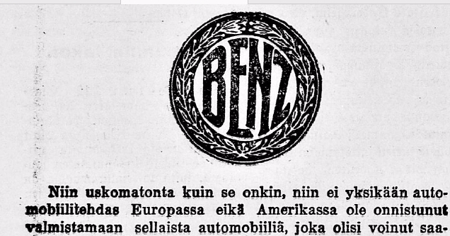 ”Niin uskomatonta kuin se onkin, niin ei yksikään automobiilitehdas Euroopassa eikä Amerikassa ole onnistunut valmistamaan sellaista automobiiliä, joka olisi voinut saavuttaa BENZ automobiilin etuisuudet.