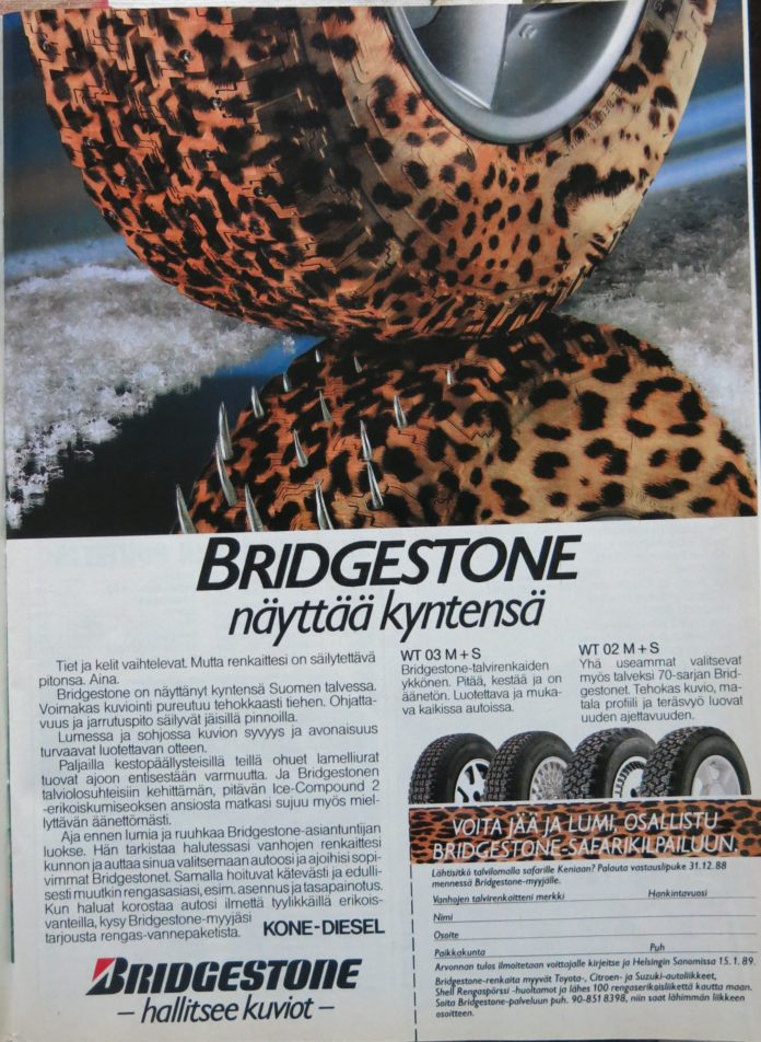 Mainoksen mukaan vuonna 1988 tarjolla oli kaksi Bridgestonen talvirengasta: WT 03 M+S ja WT 02 M0+S.
