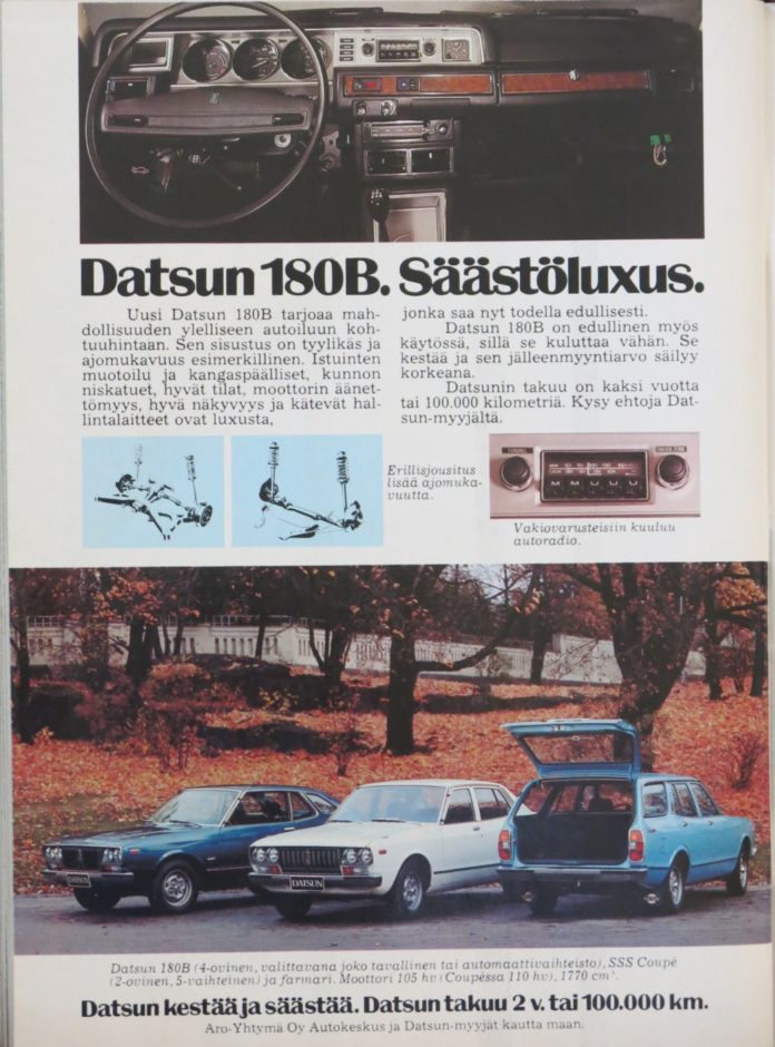 Kuvatekstinä on: ”Datsun 180B (4-ovinen, valittavana joko tavallinen tai automaattivaihteisto), SSS Coupé (2-ovinen, 5-vaihteinen) ja farmari. Moottori 105 hv (Coupéssa 110 hv), 1770 cm3.”