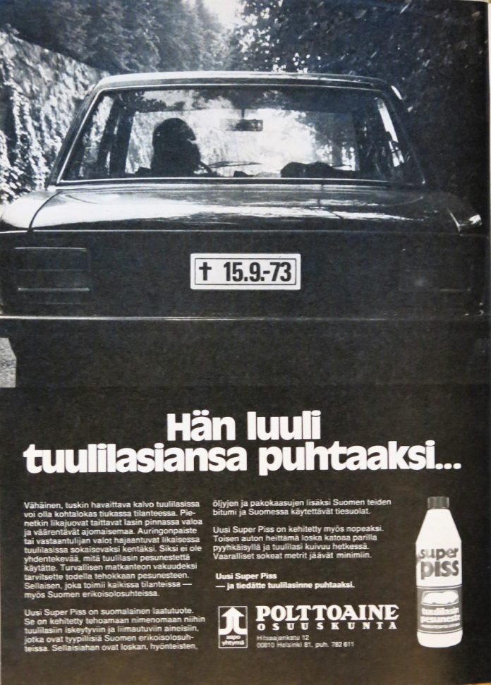 ”Vähäinen, tuskin havaittava kalvo tuulilasissa voi olla kohtalokas tiukassa tilanteessa. Pienetkin likajuovat taittavat lasin pinnassa valoa ja väärentävät ajomaisemaa. Auringonpaiste tai vastaantulijan valot hajaantuvat likaisessa tuulilasissa sokaisevaksi kentäksi. Siksi ei ole yhdentekevää, mitä tuulilasin pesunestettä käytätte. Turvallisen matkanteon vakuudeksi tarvitsette todella tehokkaan pesunesteen. Sellaisen, joka toimii kaikissa tilanteissa – myös Suomen erikoisolosuhteissa.