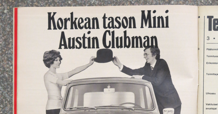 ”Onko Mini muuttunut? Eipä tietenkään. Se on vain saanut rinnakkaismallin – uutuuden – Austin Clubmanin. Menevyyttä korostaa pidennetty keula (12,5 cm pitempi). Se on nopeampi kuin perinteinen Mini. Edessä on tyylikäs säleikkö. Linjoja keventävät myös piilosaranoidut kookkaammat ovet. Sisustus on kokonaan suunniteltu uudelleen: tukevat, paksusti pehmustetut istuimet, mittarit kuljettajan edessä, säädettävät raitisilmaventtiilit kojelaudan päässä. Kokoa ja tilaa niinkuin korkean tason perheautoon kuuluukin.”