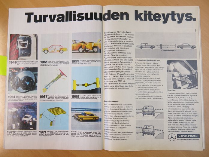 Vuonna 1972 oli Tekniikan Maailmassa aukeaman mainos, jossa esiteltiin Mersun turvaominaisuuksia.