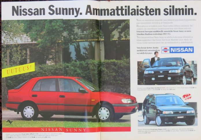 Vuonna 1991 Nissan Sunnya markkinoitiin lehtien autotestien avulla.