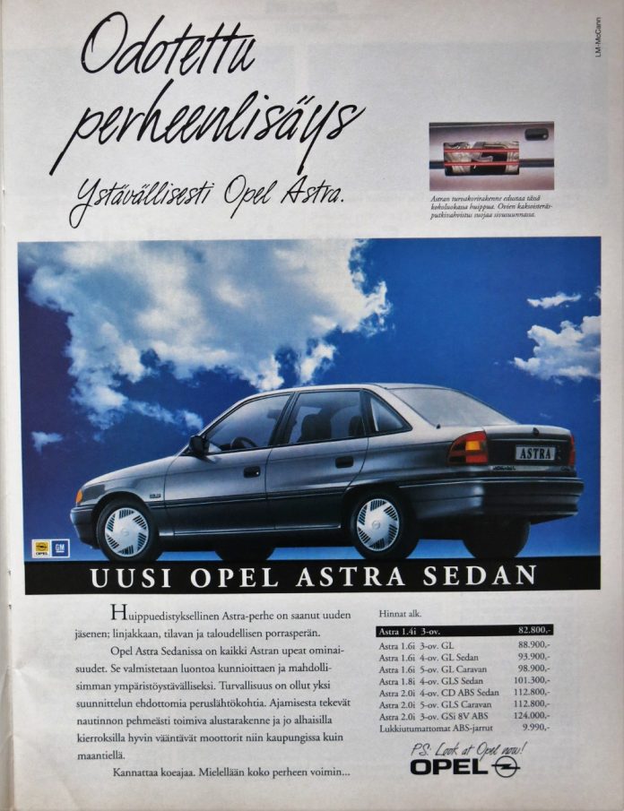Vuonna 1992 markkinoitiin uutta Opel Astra Sedan -mallia.