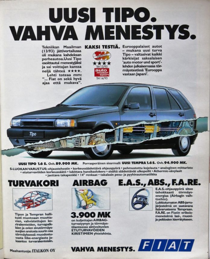Vuonna 1993 markkinoitiin Fiat Tipo menestystuotteena.