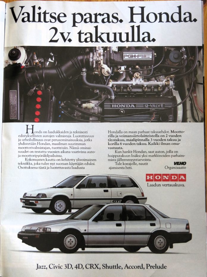 Vuonna 1985 Honda-mallistoa myytiin muun muassa kahden vuoden takuulla. Siihen aikaan merkin edustaja oli Veho.