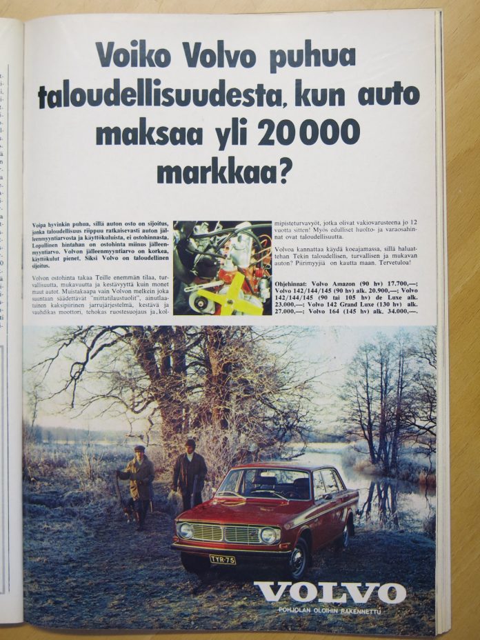 Mainoksessa mainitaan myös Volvojen hinnat: