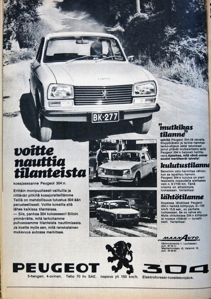 Vuonna 1971 mainostettiin Peugeot 304 -mallia tällaisella mainoksella.