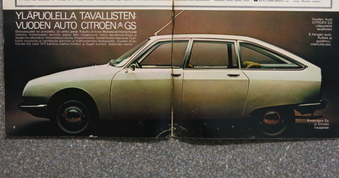 Mainoksessa todetaan: ”Ominaisuudet on arvosteltu. Ja valittu paras. Kilpailu oli kova. Mukana oli monta hyvää merkkiä. Voittamiseen tarvittiin paljon. Mm. huippuunsa vietyä aerodynamiikkaa ja modernia ulkonäköä. Ilmanestejousitusta. Etupyörävetoa. Säädettävä maavara. Tyylikästä sisustusta ja nautittavaa ajamisen ja matkustamisen mukavuutta. Vuoden Auto Citroën GS tulee 1971 kahtena mallina Confort ja Super Confort. Sittenhän näette…”