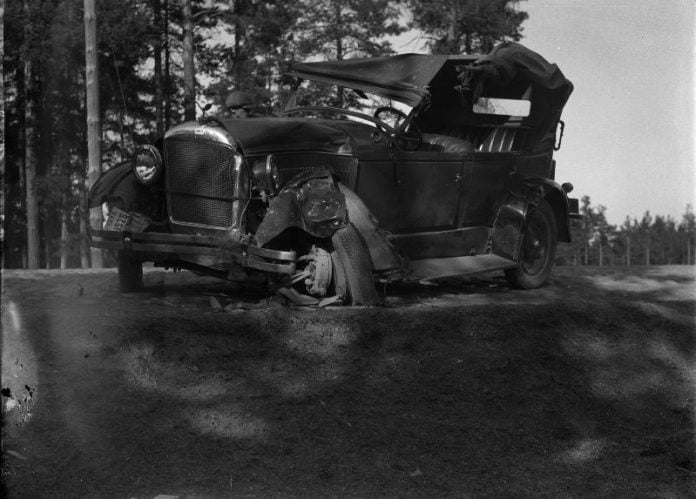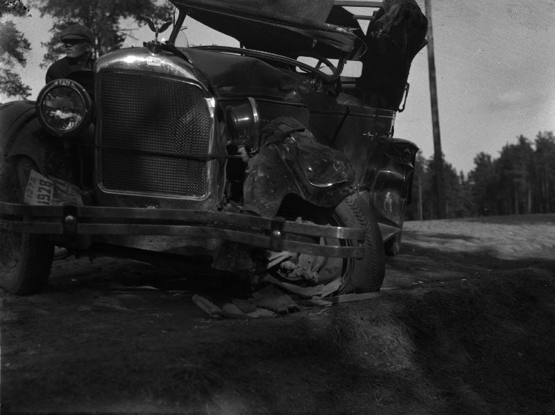 Kuvan kolari on sattunut Tampereen seudulla 1928. Kuva kuuluu Museokeskus Vapriikin kokoelmiin.