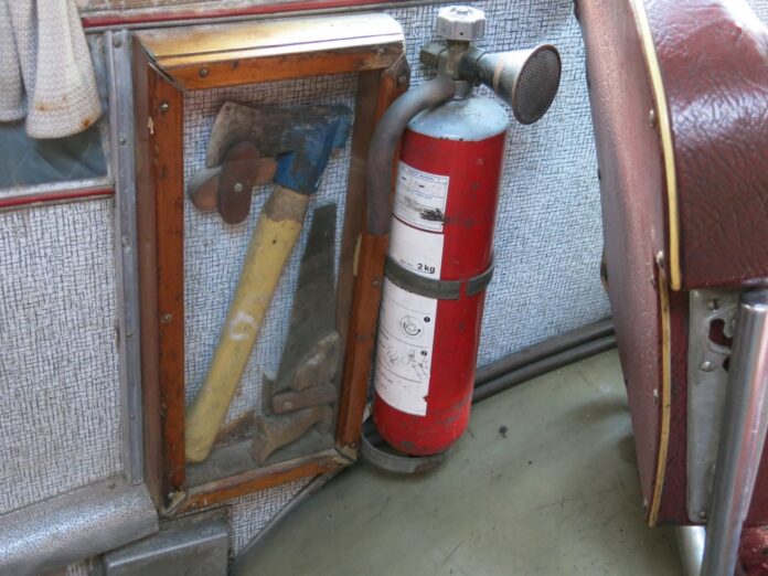 Nykyisissä busseissa on kyllä sammutin, mutta kirvestä ja sahaa ei näy. Nämä työkalut olivat vakiona kaikissa busseissa ainakin vielä 1960-luvulla.