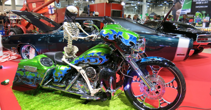 American Car Show -tapahtumassa oli esillä myös moottoripyöriä, mutta tämä oli ainoa, jota ajoi luuranko.