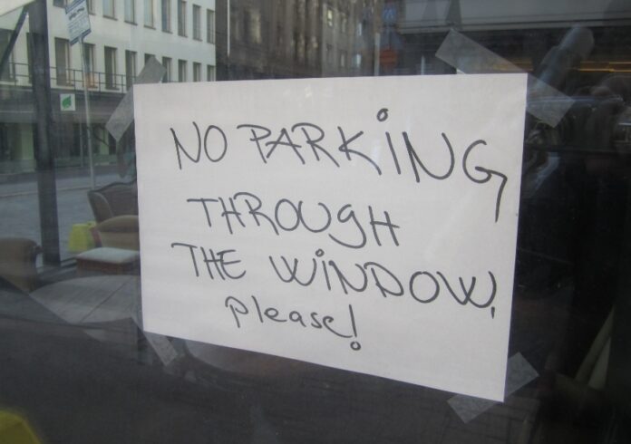 Seuraavana päivänä ravintolan henkilökunta oli laittanut oheisen lapun ikkunaan: ”Älä pysäköi ikkunan läpi, kiitos”