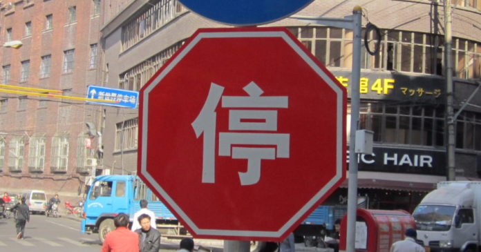 Tämän merkin muodosta ja värityksestä selviää, että kyse on Stop-merkistä, vaikkei kiinalaista tekstiä ymmärräkään.