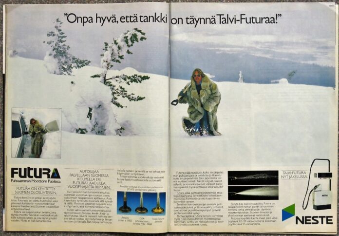 Nesteen Talvi-Futuran mainoksessa F1-kuljettaja Keke Rosberg tarpoo hangessa lumilapio kädessään autoaan kohti. Rosberg on pukeutunut täyspitkään eläinturkikseen.