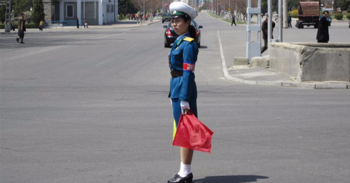 Kuvasarjan tämä kuva kertoo naisesta, joka toimi liikenteenohjaajana Pjongjangissa. Työtä ei ollut paljonkaan, koska liikenneruuhkaa ei ollut nimeksikään.