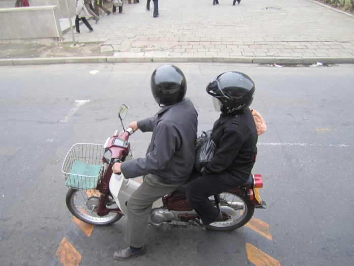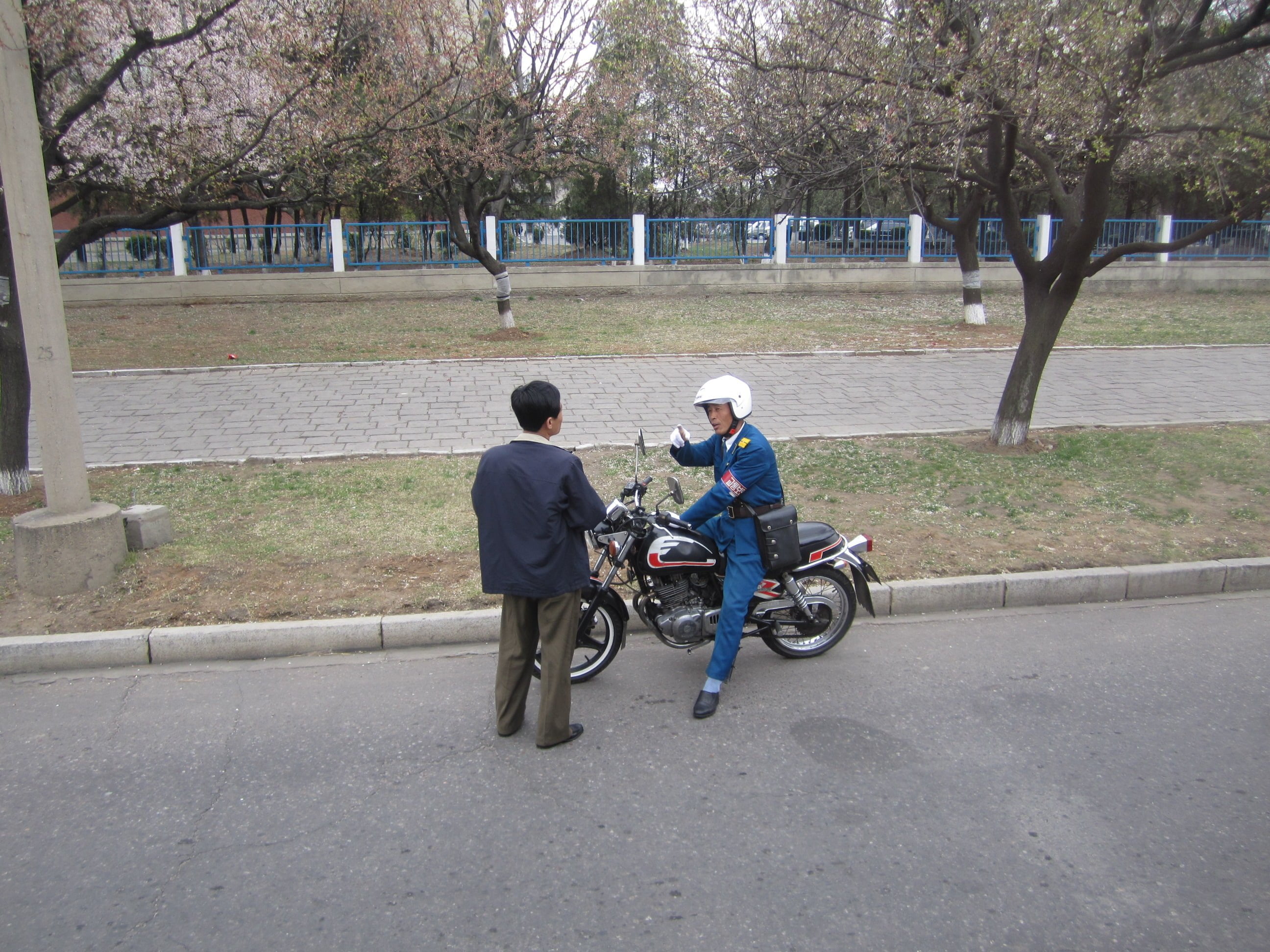 Nyt on kyse moottoripyöräilijöiden kypäristä! Kyllä Pohjois-Koreassakin tiedetään, että moottoripyöräilijöiden on hyvä käyttää kypärää.