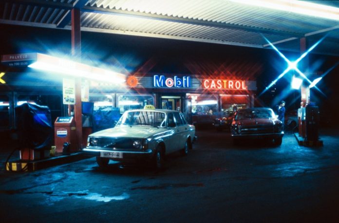 Volvo 244 -taksi on kuvattu Unionin huoltamolla 1980-luvulla.